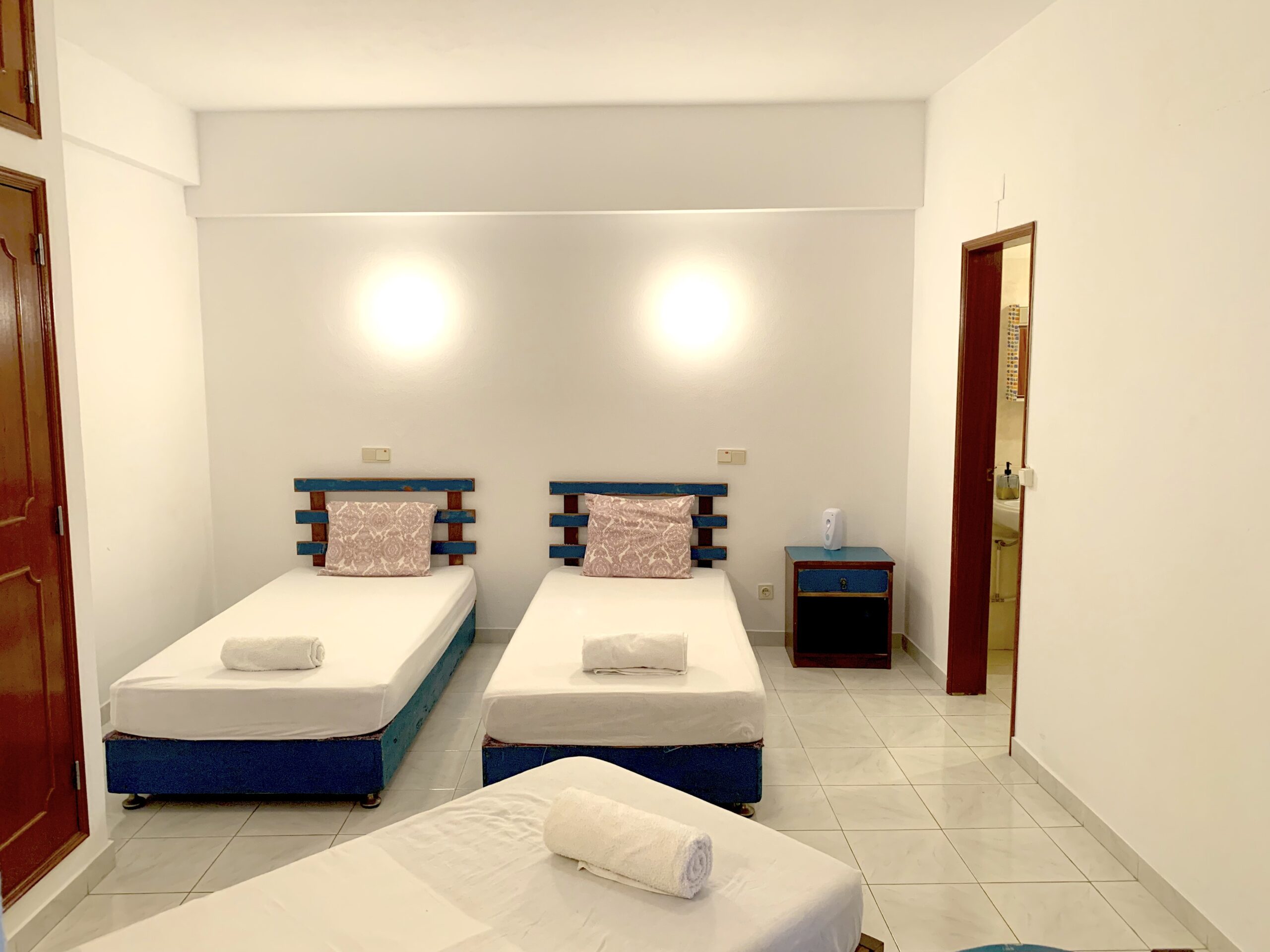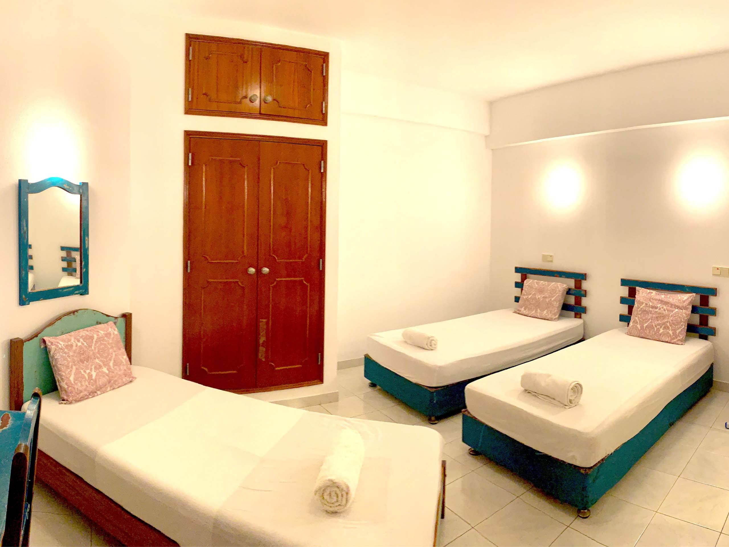 Room with three single beds.