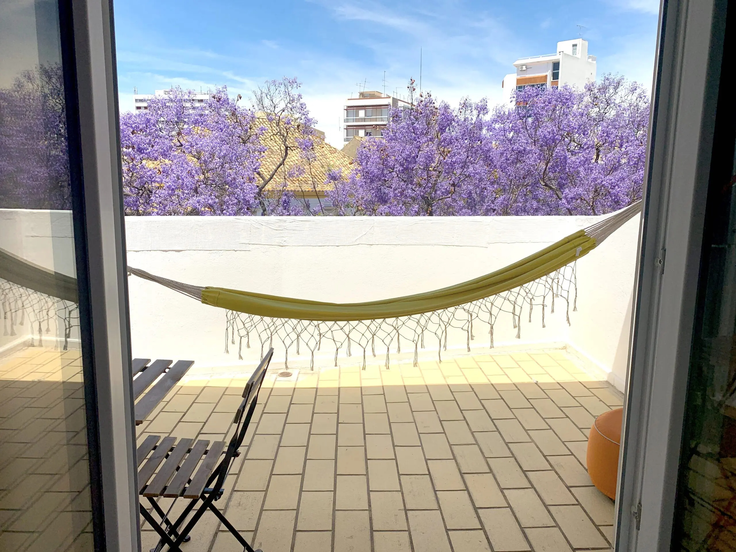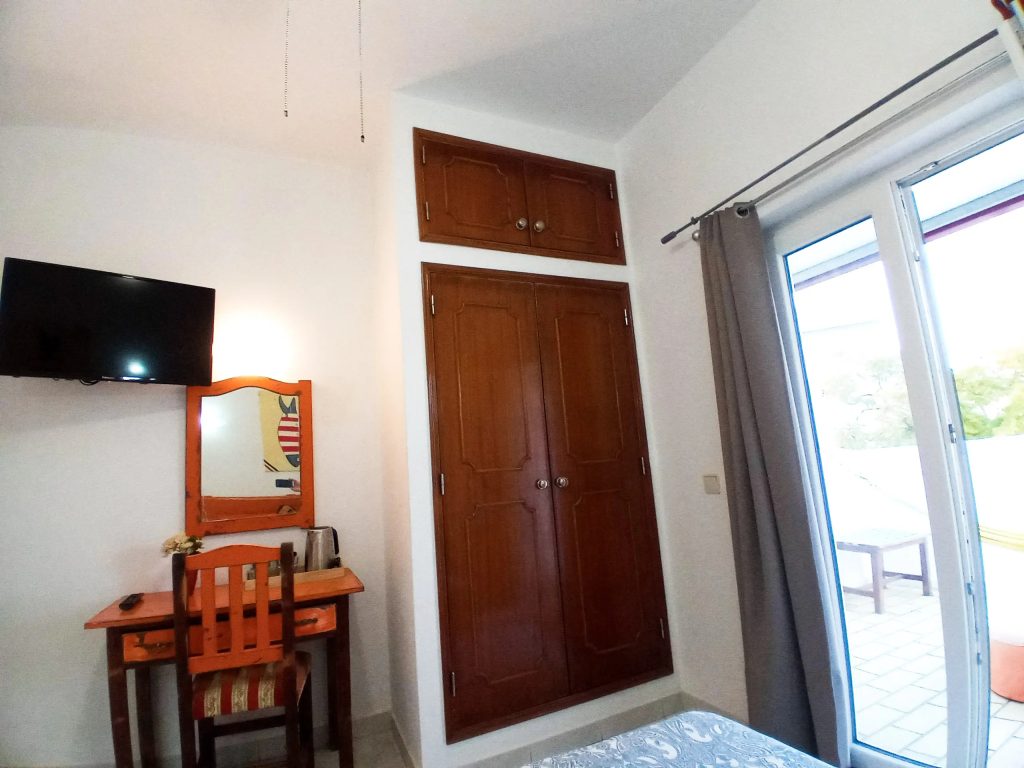 It has a private bathroom, desk, TV, balcony, with hammock and a beautiful view of the outdoor area.