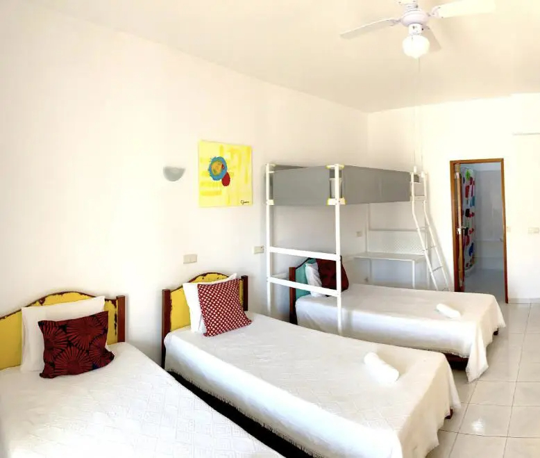 Bedroom with bunk beds and three single beds.